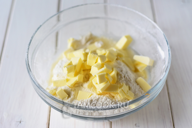 Ледяное масло порезать мелким кубиком и закинуть к просеянной муке.