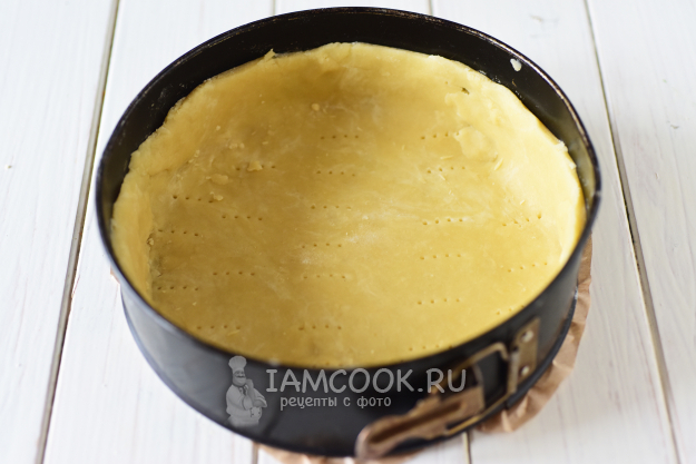 Затем охлажденное тесто раскатать скалкой в пласт, соизмеримый с размером формы плюс бортики 4 см, и перенести на скалке в форму, застеленную пергаментом для выпечки. Горизонтальную поверхность теста наколоть вилкой.