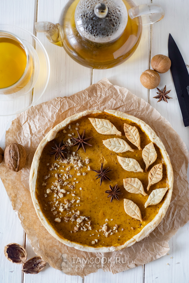 Готовый пирог очень хорошо охладить - я охлаждала ночь. Так как начинка очень нежная, то надо дать время на стабилизацию, иначе порезать на аккуратные кусочки пирог не получится. Охлажденный пирог можно очень красиво украсить, я, к примеру, вырезала ножом из остатков теста листочки и испекла их до румяности, разложила по поверхности тыквенной начинки, немного присыпала тертым грецким орехом и разложила звездочки бадьяна.