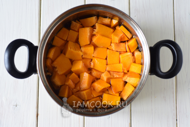 Приготовим тыквенное пюре. Тыкву разрезать на удобные сегменты, очистить от семян и кожуры, порезать небольшими кубиками, выложить в кастрюлю, залить водой, поставить вариться до мягкости. Я варила тыкву 20 минут.