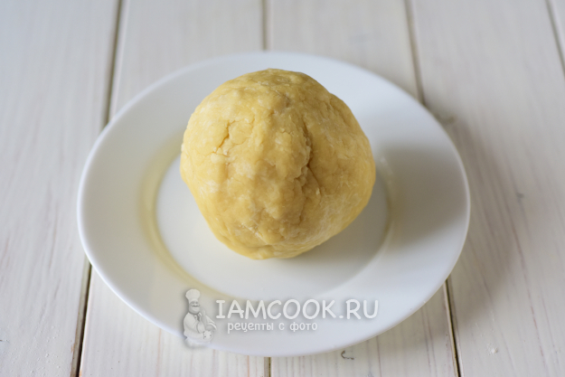 Залить к мучной крошке ледяную лимонную воду и руками замесить мягкое тесто, собрать его в шар, завернуть в пищевую пленку и на 20 минут положить на полку холодильника.