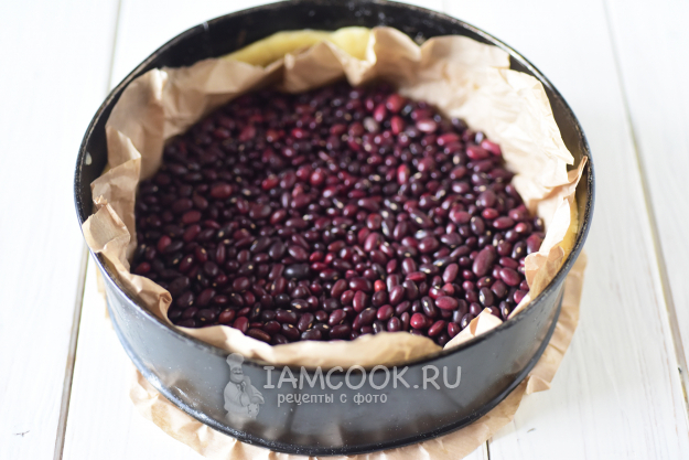 На дно заготовки из теста положить кусочек пищевого пергамента, на который насыпать груз, например, фасоль. Форму с основой под гнетом поставить в уже раскаленную до 180 градусов духовку на 10 минут.