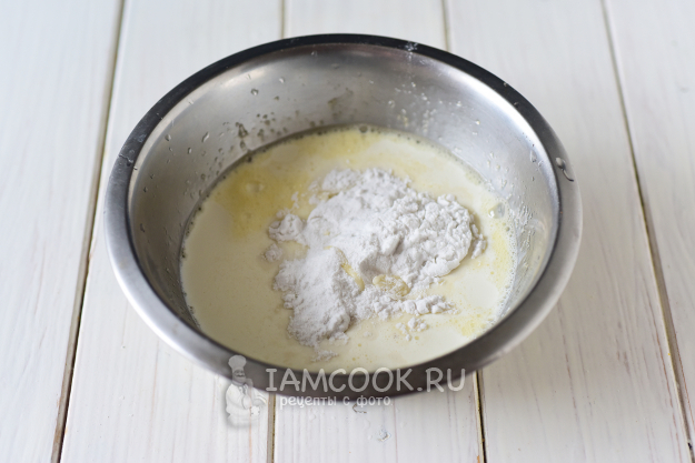 Добавить к яичной смеси сливки и крахмал, опять энергично перемешать все венчиком.