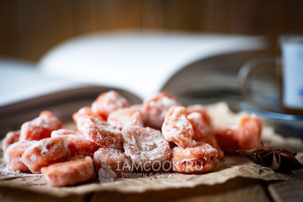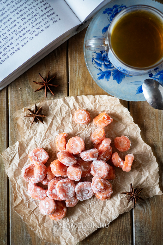 Готовые цукаты из моркови осталось лишь обвалять в смеси сахарной пудры и крахмала и подать к чаю.