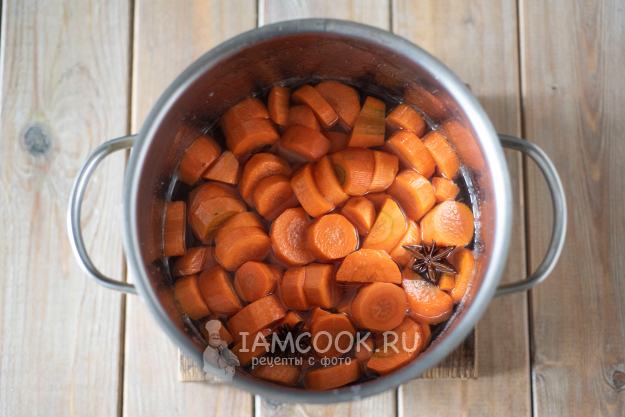 Следом закинуть кружочки моркови и дождаться, когда сироп вновь закипит, помешивая деревянной ложкой, варить в сиропе 10 минут.