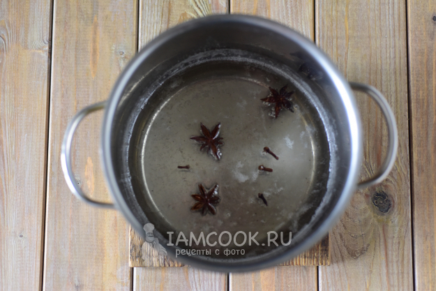 Дождаться, когда сироп закипит и станет прозрачным, то есть сахар полностью растворится, закинуть бадьян и гвоздику.