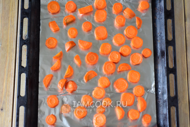 Затем откинуть морковные кружочки на сито и слить сироп в отдельную емкость - он может быть использован в выпечке. Кружочки разложить на противне, предварительно застелив его фольгой. Я сушила в духовке 6 часов при температуре 100 градусов с нижним подогревом, вставив железную ложку между дверцей и плитой, сделав зазор для доступа воздуха.