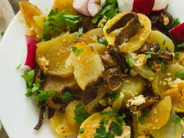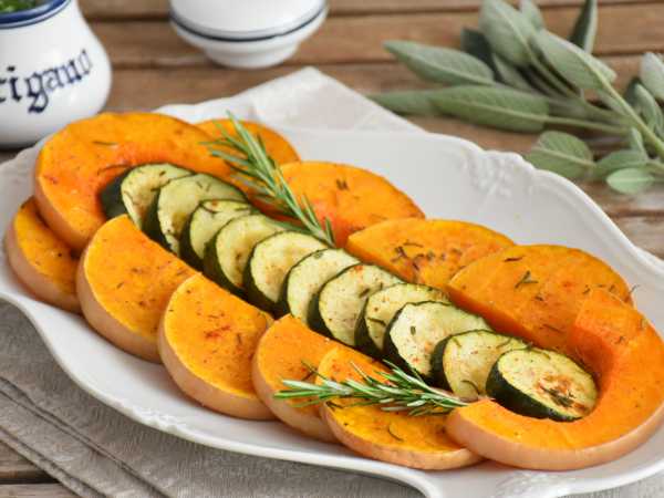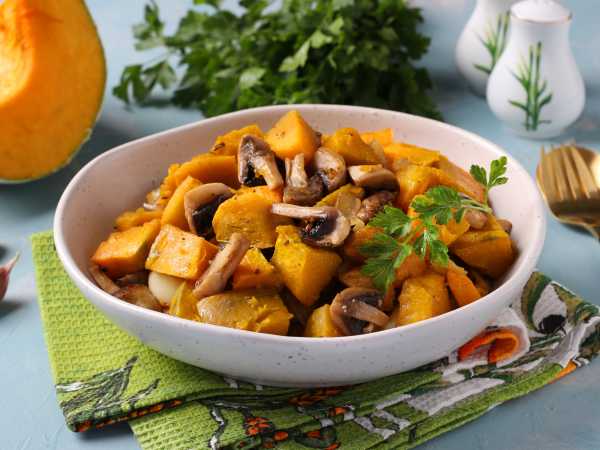 Запекать тыкву с грибами в духовке ещё 10 минут. Готовый гарнир оставить ещё на 5-10 минут в выключенной духовке.