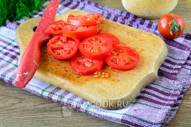 Вымытые помидоры нарежьте средними по толщине колечками.