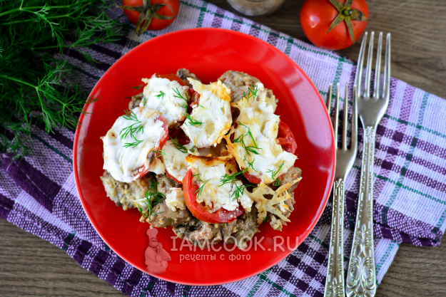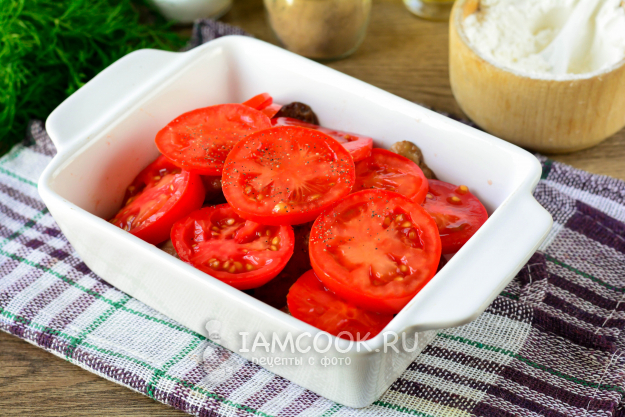Поверх печени выложите слой помидоров, посолите и поперчите овощи.