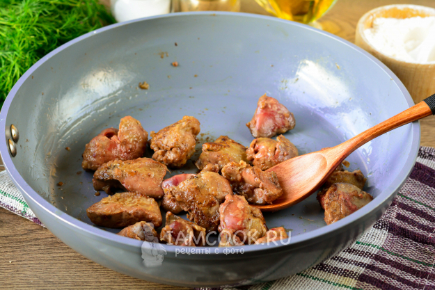 Разогрейте на сковороде немного растительного масла, включив средний огонь, положите печень и обжаривайте со всех сторон около 3-4 минут. Важно поджарить куриную печень, а не приготовить ее полностью. При обжарке добавьте по вкусу соль и черный перец, периодически помешивайте.