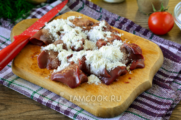 Запанируйте кусочки печени в пшеничной муке - так печень после приготовления получится вкуснее.