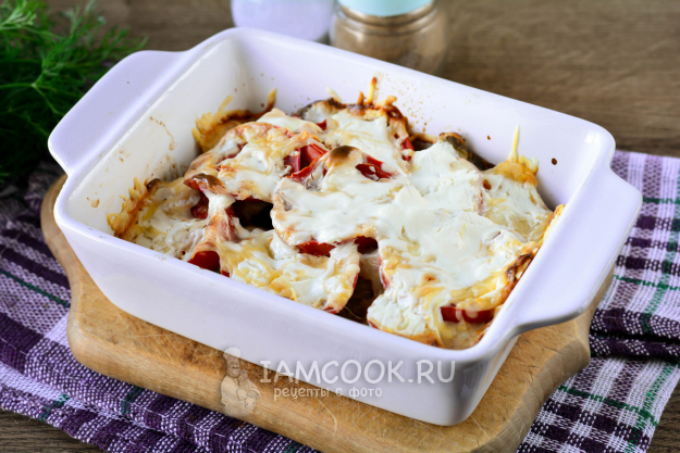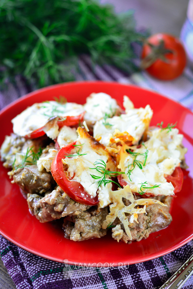 Запекайте куриную печень с помидорами и сыром в духовке при 190-200 градусах примерно 25-30 минут.