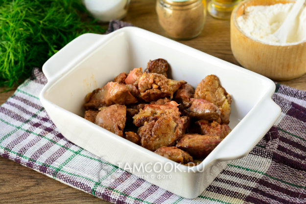 Обжаренную печень выложите на дно форму для запекания.