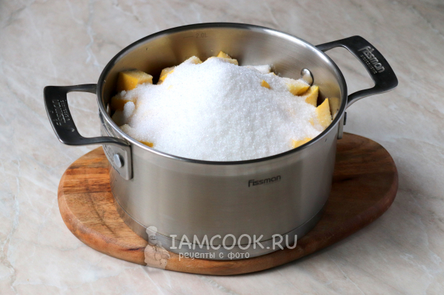 Подготовленную нарезку выложите в объемную кастрюлю и засыпьте сахарным песком.