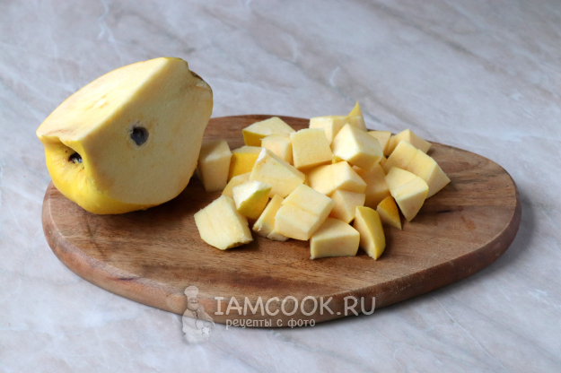 Айву промойте под холодной проточной водой, нарежьте таким же способом, как и тыкву, предварительно удалив семена.
