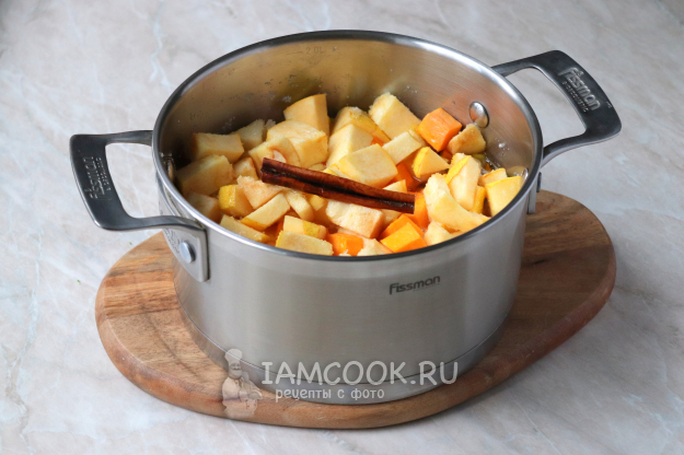 По истечению времени добавьте в кастрюлю палочку корицы и отправьте варочную ёмкость на огонь.