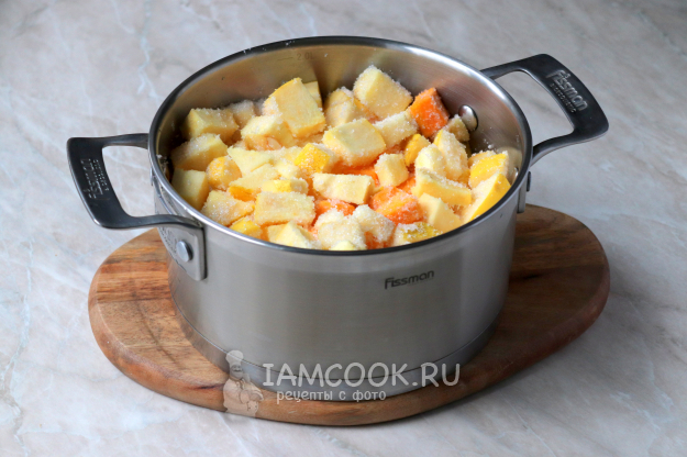 Тщательно перемешайте и оставьте на 3 часа при комнатной температуре. Плоды должны пустить сок, в котором растворится часть сахарного песка.