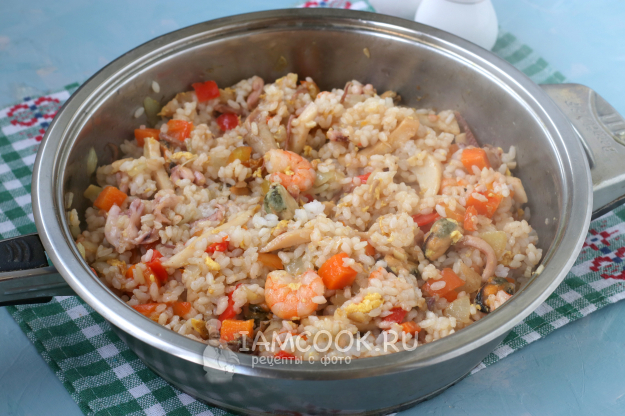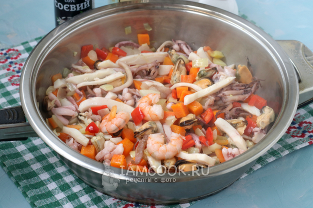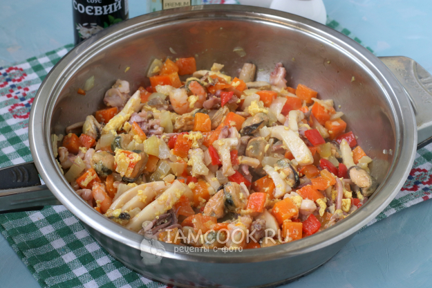 Затем в сковороду добавить морепродукты и готовить всё вместе 7 минут на среднем огне.