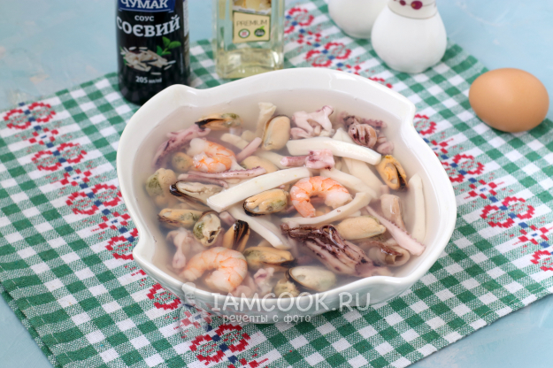 Морской коктейль промыть под проточной водой, выложить в тарелку и залить кипятком на 6-7 минут. Спустя время воду слить.