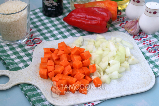 Почистить лук с морковью и нарезать небольшими кубиками.