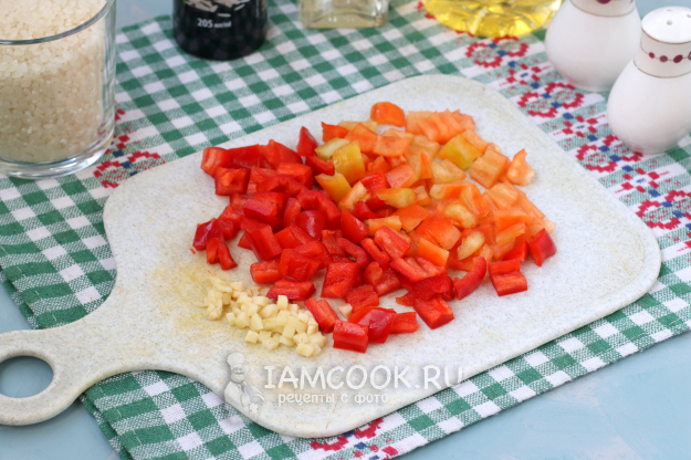 У перцев удалить плодоножку и сердцевины, нарезать перец кубиками. Измельчить чеснок.