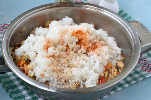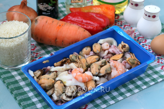 Для приготовления сифудо тяхан с морепродуктами (креветками, мидиями, кальмарами, осьминогами) и овощами подготовить из списка необходимые ингредиенты. Рис тщательно промыть несколько раз до прозрачности воды. В кастрюле вскипятить воду, всыпать рис, добавить соль и варить рис до готовности. Оставить рис настояться под крышкой.