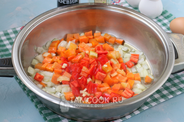 В сковороде разогреть растительное масло и отправить туда лук с морковью, обжарить пару минут и добавить сладкий перец с чесноком. Готовить 1-2 минуты.