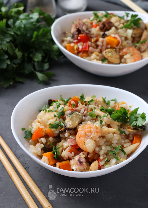 Готовый рис разложить по порциям и можно дегустировать - сифудо тяхан с морепродуктами готов.