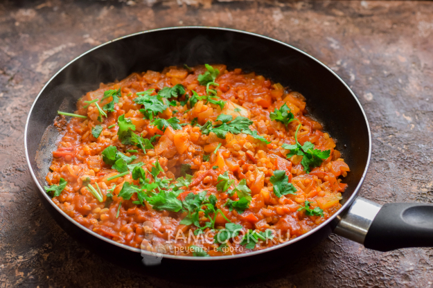 Готовое блюдо посыпать зеленью и подавать к столу - булгур по-турецки (с томатами) готов.