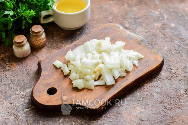 Очистить и сполоснуть репчатый лук, просушить и нарезать небольшими кубиками.