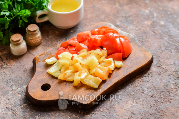 Сладкий перец очистить и сполоснуть, просушить, помидоры и перец нарезать также небольшими кубиками.