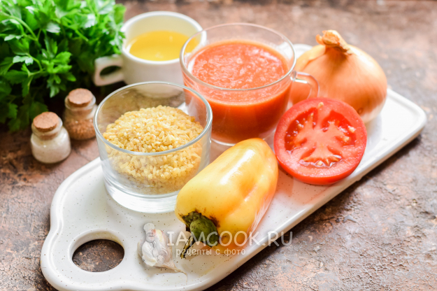 Возьмите все продукты для приготовления булгура по-турецки.