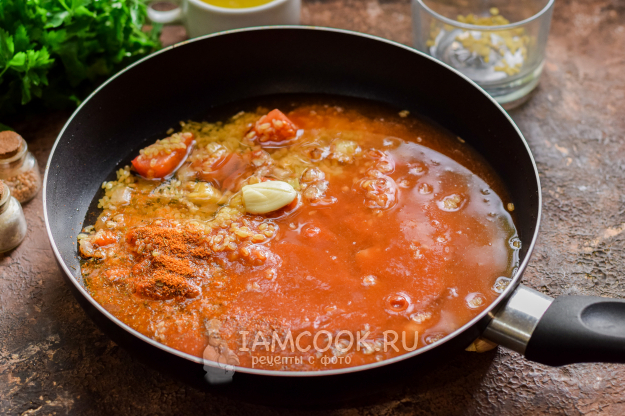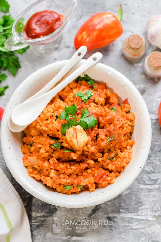 Влить в сковороду томат и воду, добавить два вида паприки, соль и перец по вкусу. Прикрыть сковороду крышкой и готовить булгур на небольшом огне 20 минут.