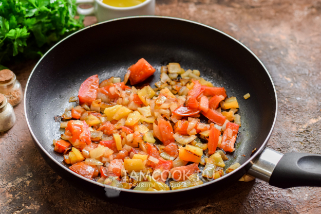 В сковороде разогреть растительное масло, выложить лук, перец и помидоры. Жарить 4-5 минут, помешивая, на небольшом огне.