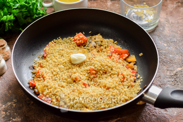 После всыпать в сковороду стакан булгура, добавить раздавленный в прессе зубчик чеснока.