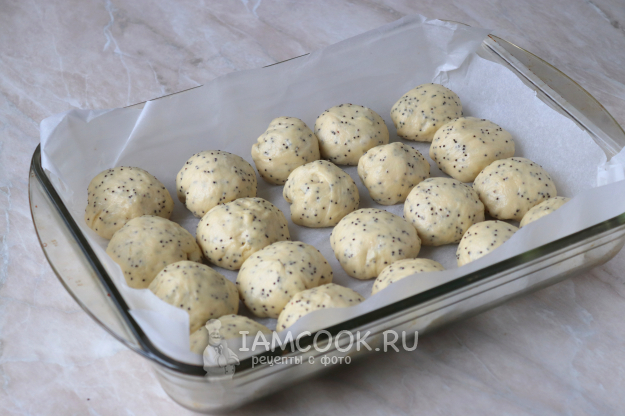 Обомните его и разделите на небольшие кусочки, желательно одинакового размера (для точности можно воспользоваться кухонными весами). Каждую часть теста скатайте в шарик и выложите в жаропрочную форму, застеленную пергаментом (у меня получилось 20 штук). Накройте форму полотенцем и оставьте на 15 минут для повторного подхода теста.