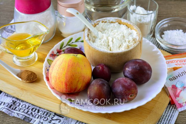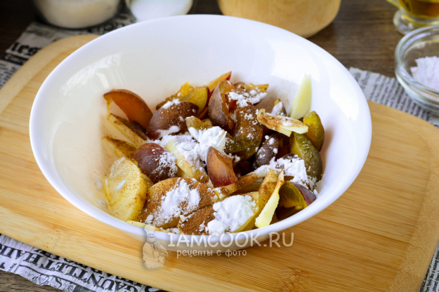 Перемешайте яблоки со сливами, всыпьте крахмал и корицу. С крахмалом начинка не потечет. Корица придаст дополнительный аромат. Кстати, корица хороша не только с яблоками. Сливы тоже отлично вписываются в такую начинку.