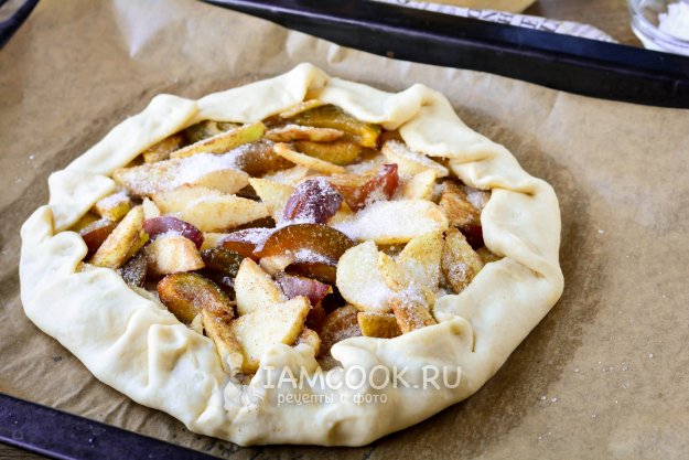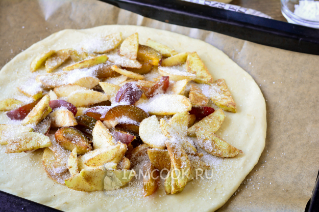 Тесто тонко раскатайте, толщиной примерно 0,5-0,6 см, в виде круга, переложите на противень. В центр выложите всю фруктовую начинку, присыпьте яблоки и сливы сахаром.