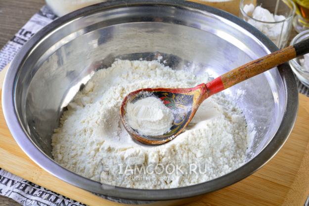 Просейте пшеничную муку в миску, смешайте муку с сухими ингредиентами - всыпьте соль, немного ванилина и разрыхлитель.