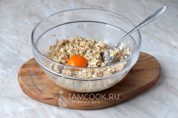 Тем временем яйцо разделить на желток и белок. Желток добавить в миску с хлопьями и перемешать.