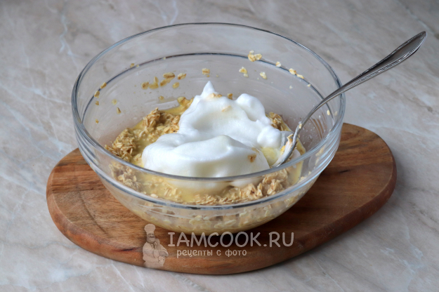 Переложить взбитый белок к набухшим хлопьям и аккуратно перемешать, чтобы сохранить ценные пузырьки воздуха.