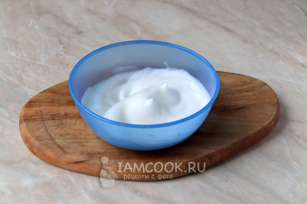 Белок с помощью миксера взбить в крепкую стойкую пену. Если будет плохо взбиваться, можно добавить щепотку соли.