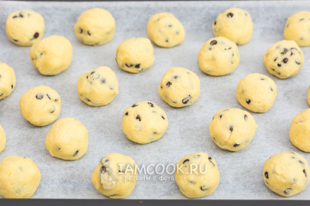 Из теста сформируйте шарики размером с грецкий орех, выложите на противень, застеленный пергаментом.