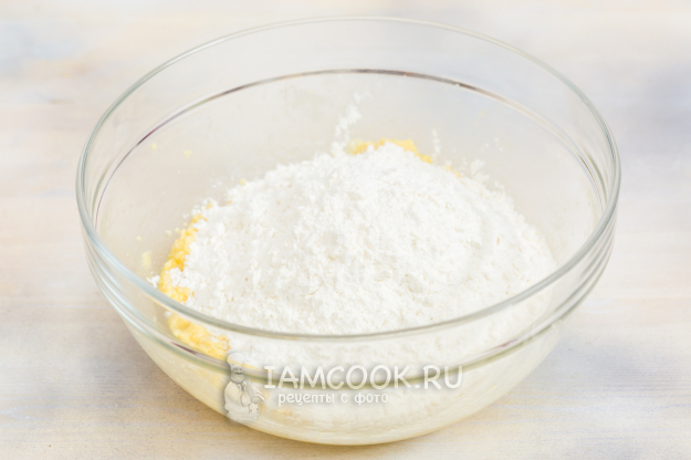 Добавьте муку, смешанную с разрыхлителем. Не добавляйте сразу всю муку: возможно, вам понадобится ее меньше или больше.