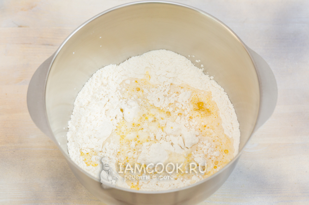 Смешайте муку, дрожжи, соль, сахар.