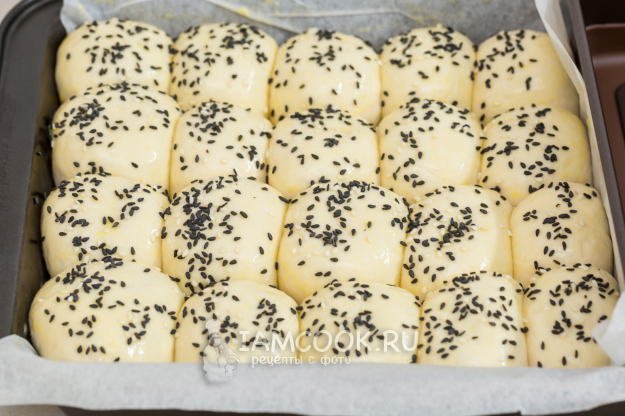 Через 20 минут смажьте заготовки яйцом и присыпьте кунжутом (льном, маком).