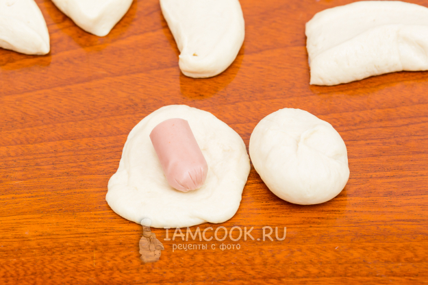 Кусочки теста разомните руками в круг, выложите сосиску и края теста соберите в центр. Сформируйте маленькую булочку.