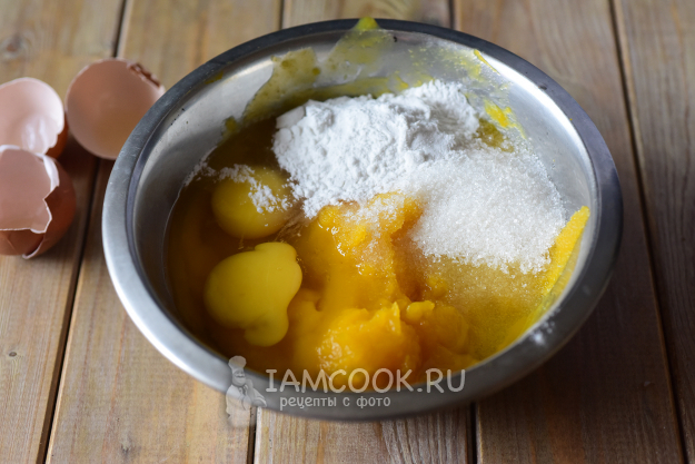 В миску к охлажденному пюре вбить яйца, добавить сахар, засыпать крахмал.