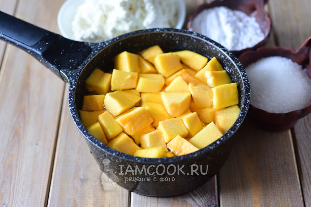 Теперь нужно приготовить тыквенное пюре. Мне удобнее всего было порезать кубиками мякоть тыквы, загрузить в сотейник, залить водой и поставить вариться примерно на 20 минут с момента закипания жидкости, до мягкости тыквенных кусочков. Вы можете приготовить тыквенное пюре удобным для себя способом.